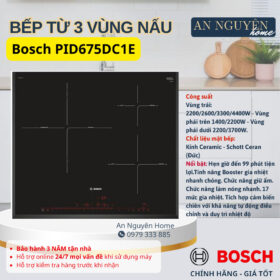 Bếp từ ba vùng nấu lắp âm Bosch PID675DC1E thiết kế sang trọng, công suất lớn, tính năng an toàn và đa tiện ích như hẹn giờ nấu 99 phút, giữ ấm thực phẩm,… chính là lựa chọn tốt cho bếp nấu gia đình Việt.
