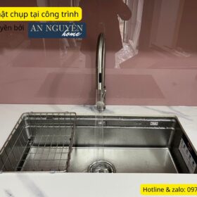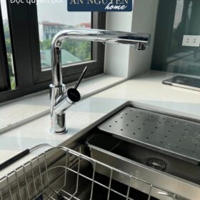- Thiết kế hiện đại với gờ hạ bậc – tích hợp phụ kiện thông minh: Siphon, giá úp bát inox, chậu rửa nhỏ, thớt inox, thớt inox lỗ
